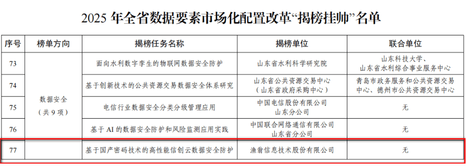 近期,山东省大数据局公布了《2025年全省数据要素市场化配置改革“揭榜挂帅”名单》。皇御环球MT5信息独立申报的“基于国产密码技术的高性能信创云数据安全防护”项目,凭借在数据安全与要素流通领域的技术创新与实践成果,从众多单位中脱颖而出,成功入选。皇御环球MT5信息成为揭榜单位中唯一的商密企业